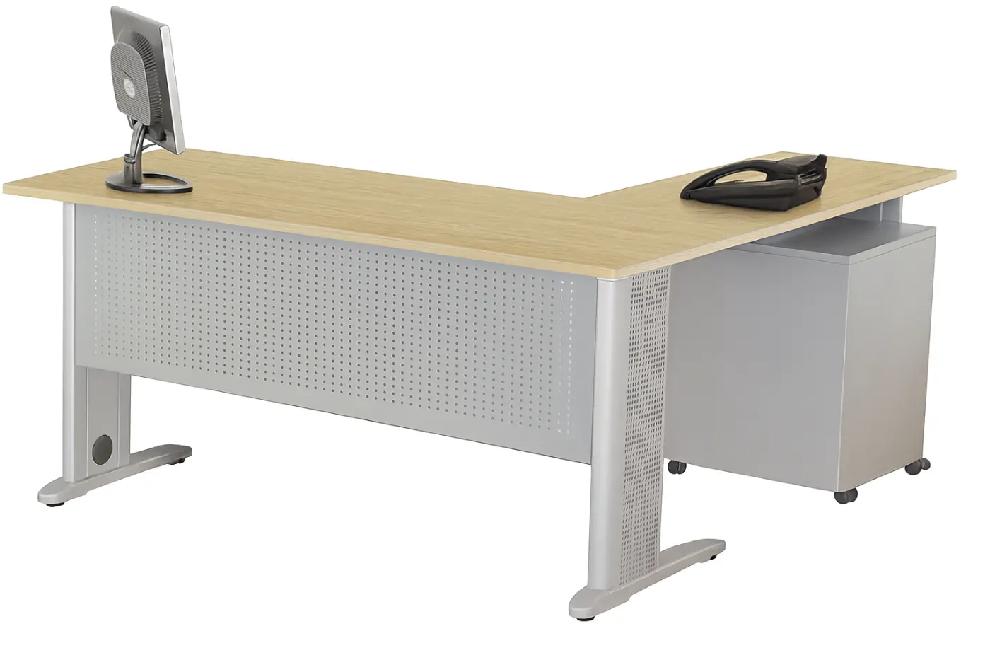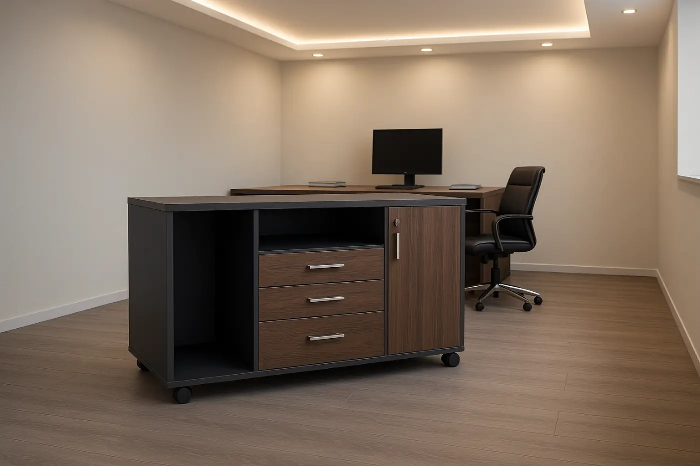 Credenza en melamina con tres cajones, una puerta y rodajas.