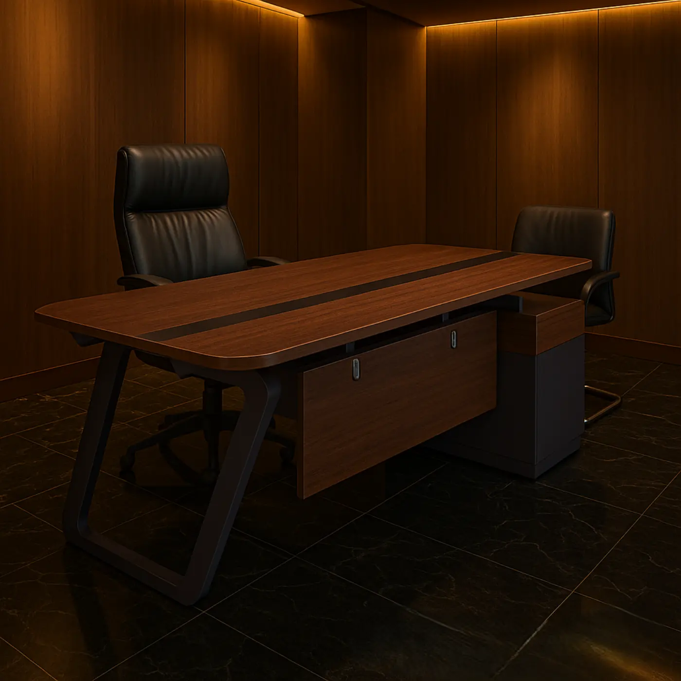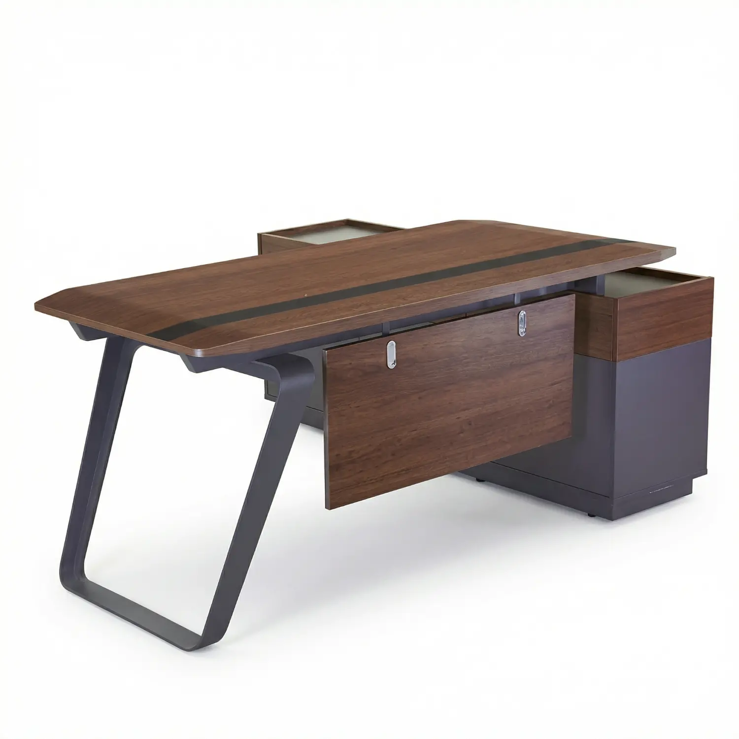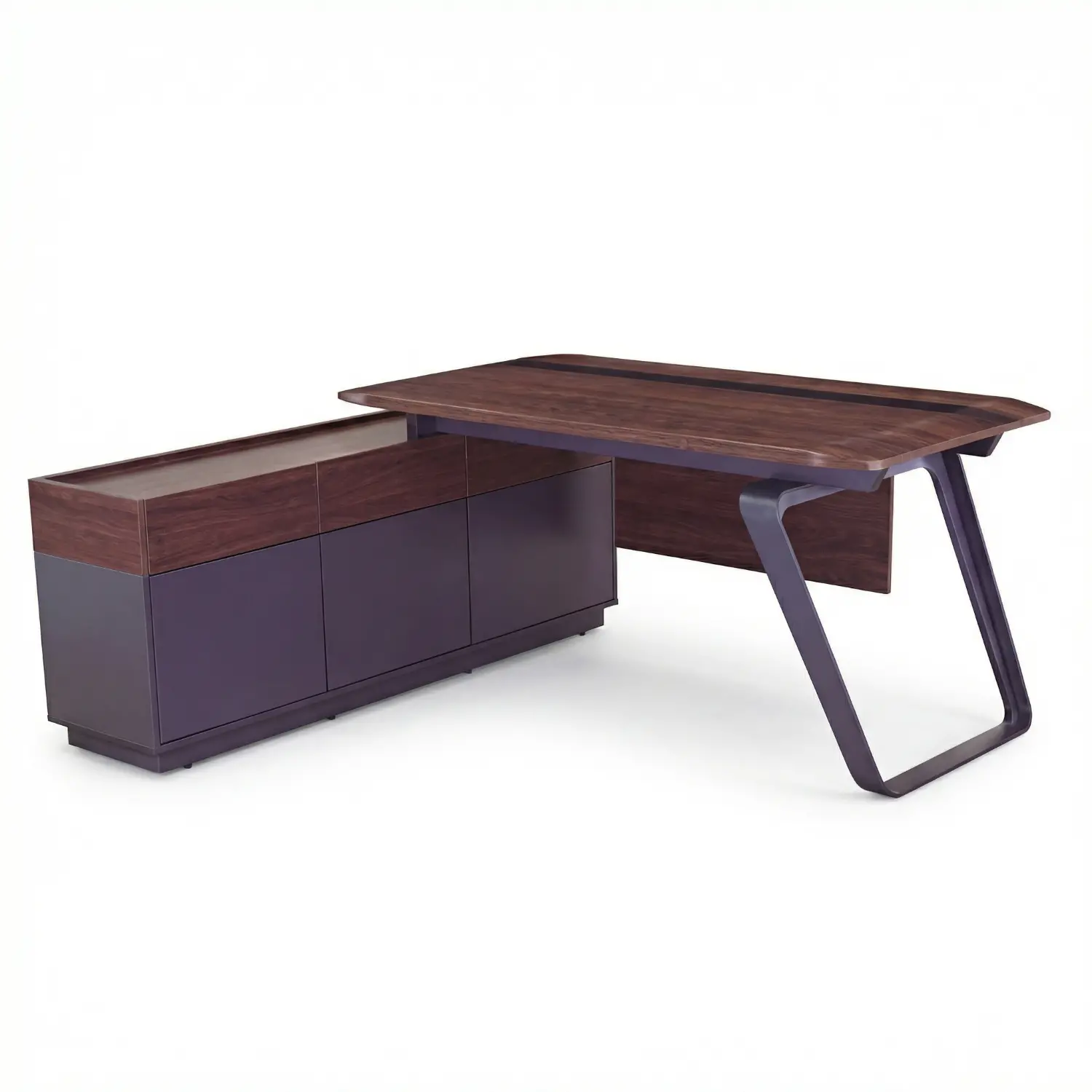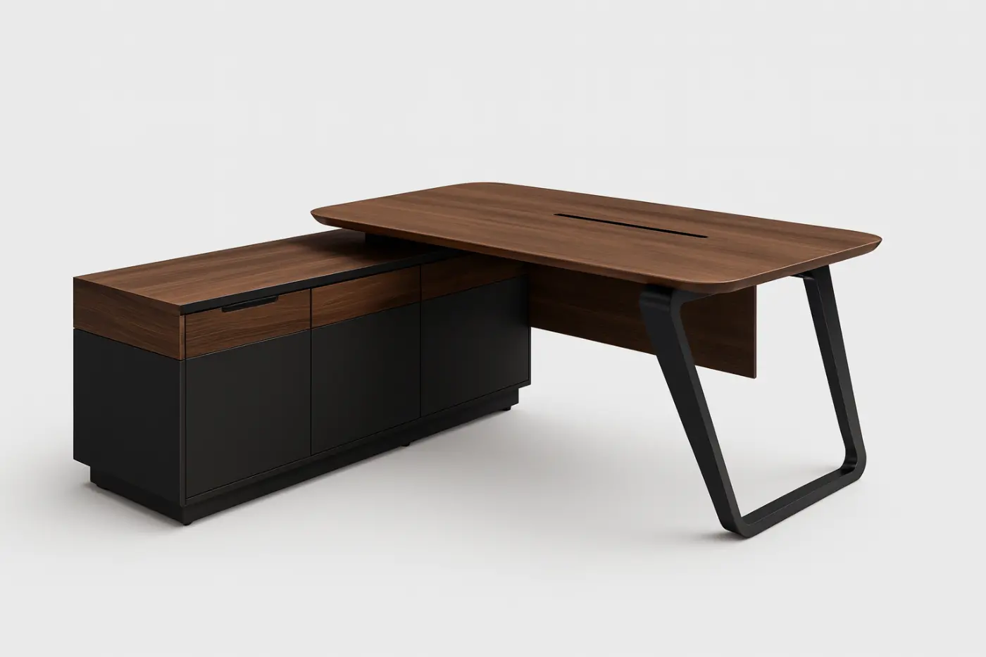 Escritorio directivo en L con base metálica y credenza lateral integrada.