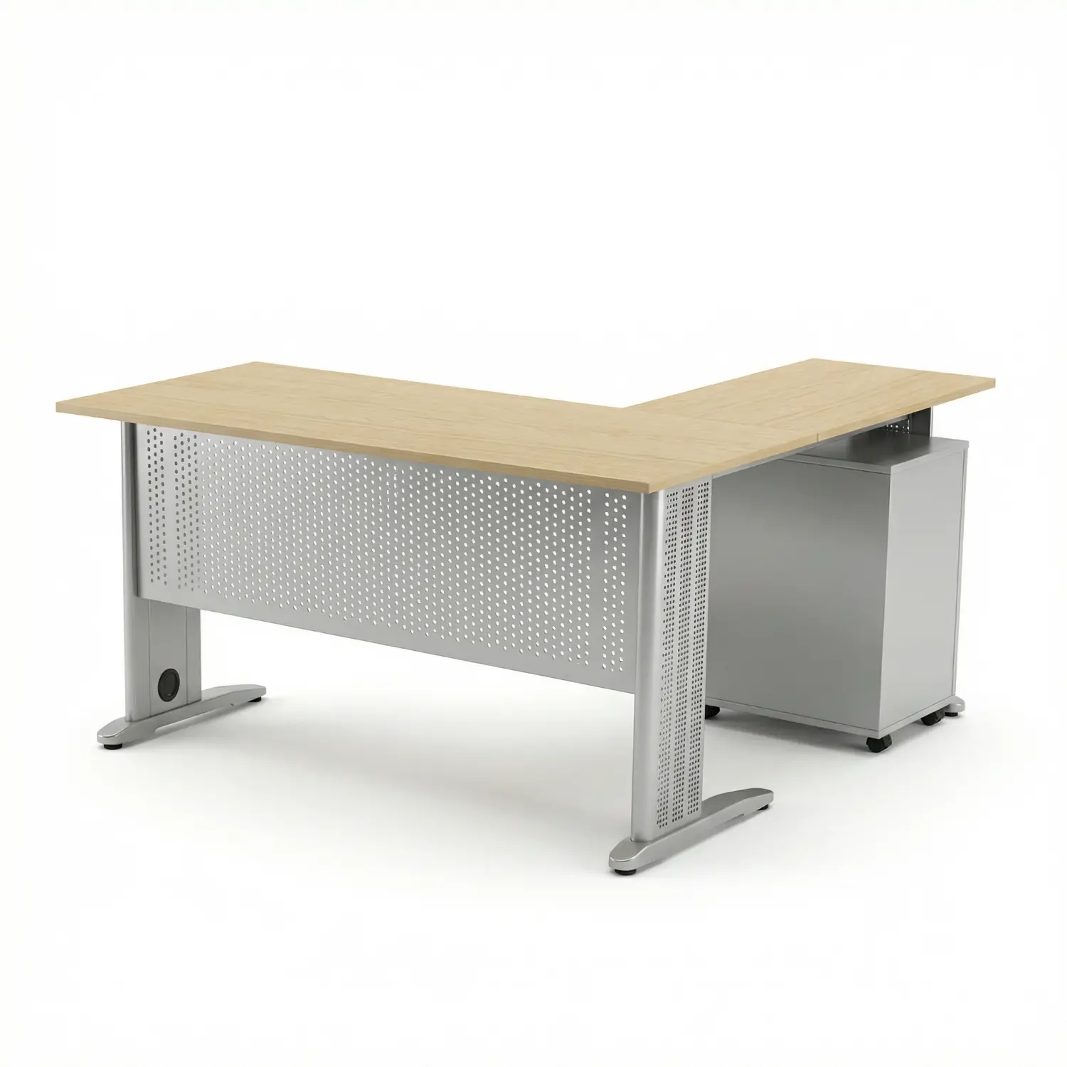 Escritorio ejecutivo extensible con base de acero y cubierta en melamina.