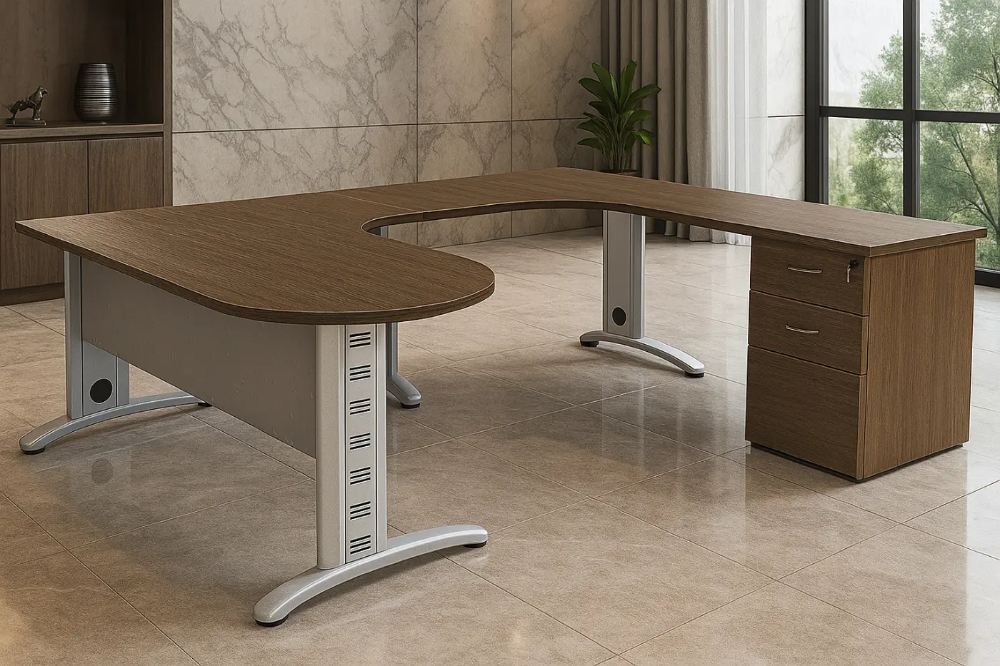 Escritorio ejecutivo extensible con estructura de acero y pedestal en melamina.