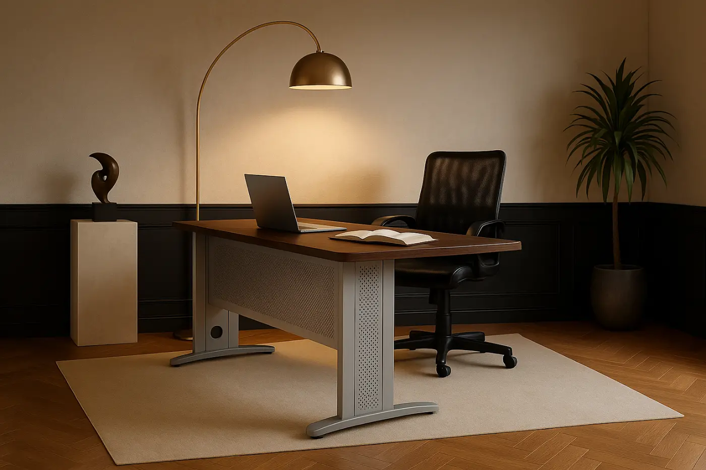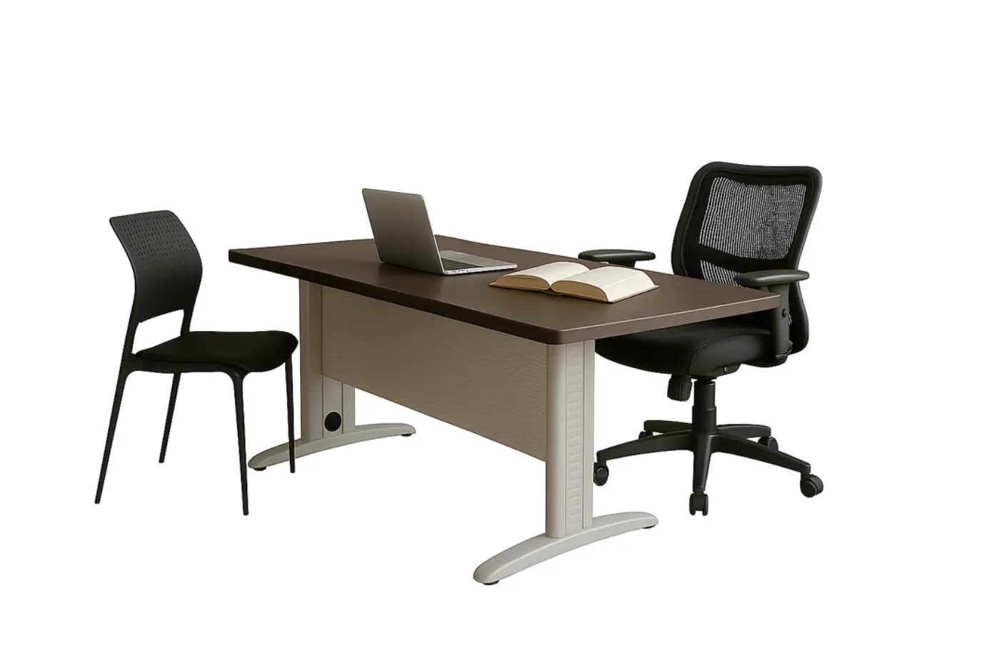 Escritorio operativo extensible con base de acero y cubierta en melamina.