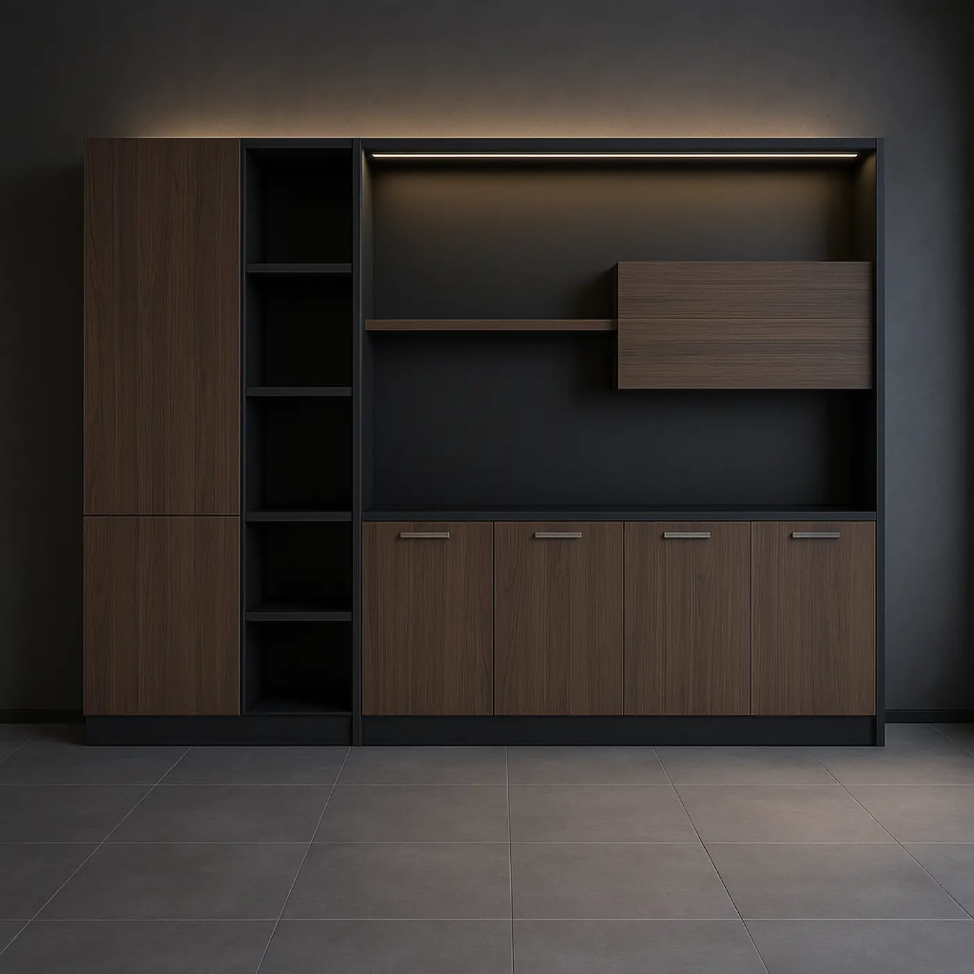 Librero en melamina con guardarropa, archivero y entrepaños abiertos