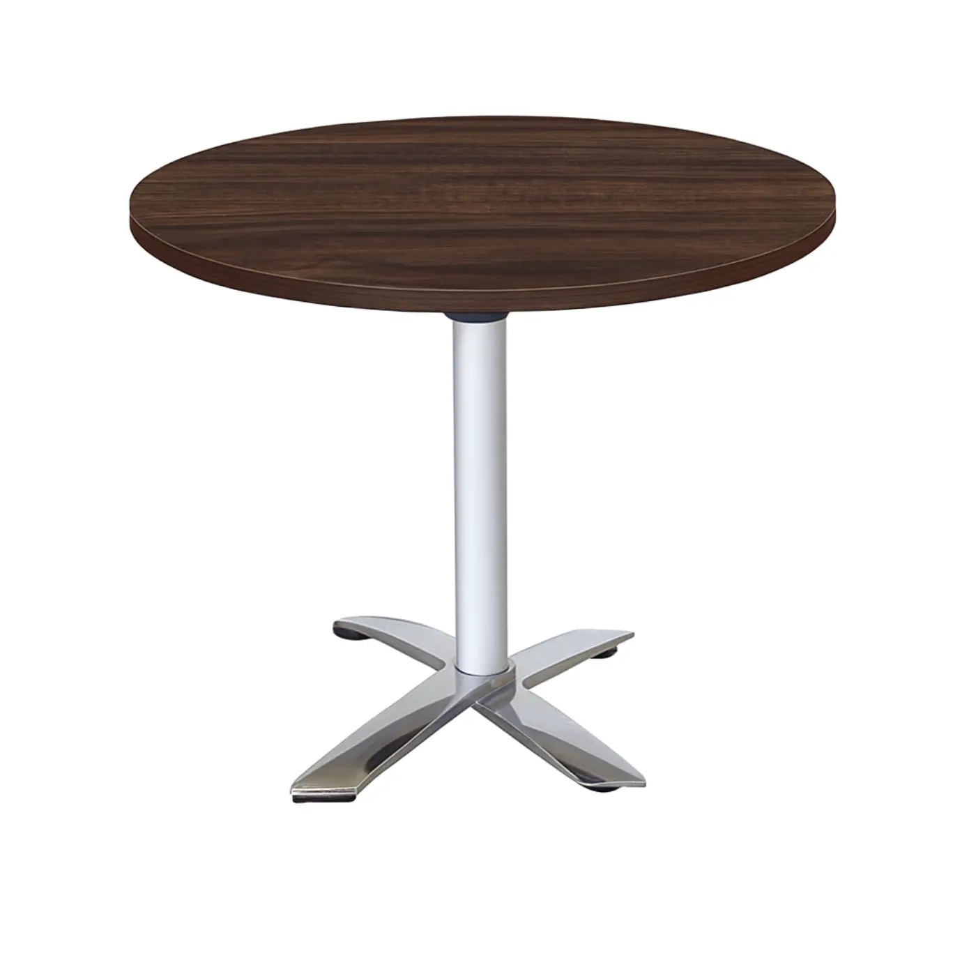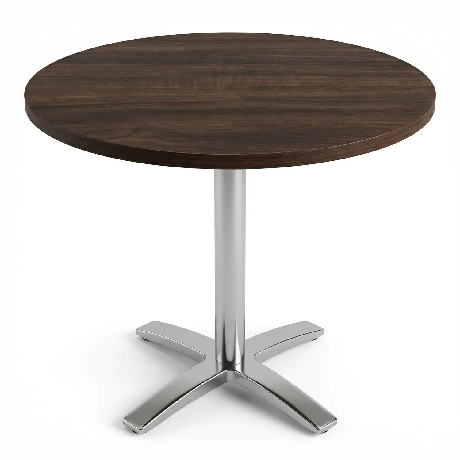 Mesa redonda con base metálica estilo cromo. Cubierta en melamina de 28 mm, adecuada para espacios colaborativos o de descanso.