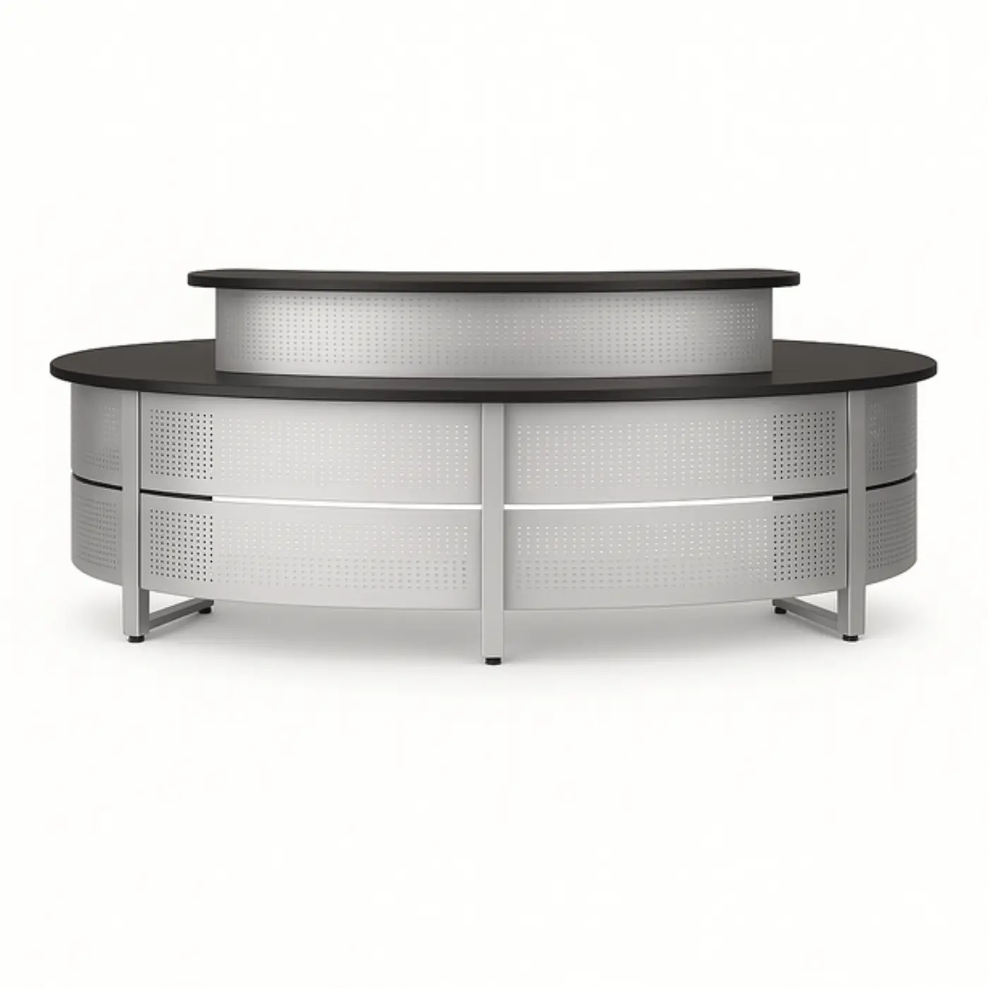 Estructura en acero y patas tubulares. Faldón curvo y copete en acero. Cubierta de 28 mm en melamina.