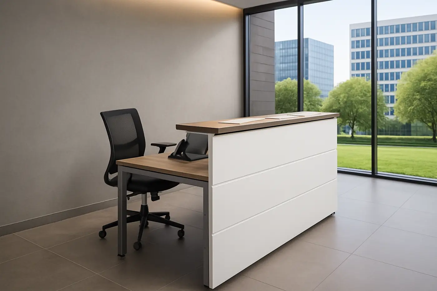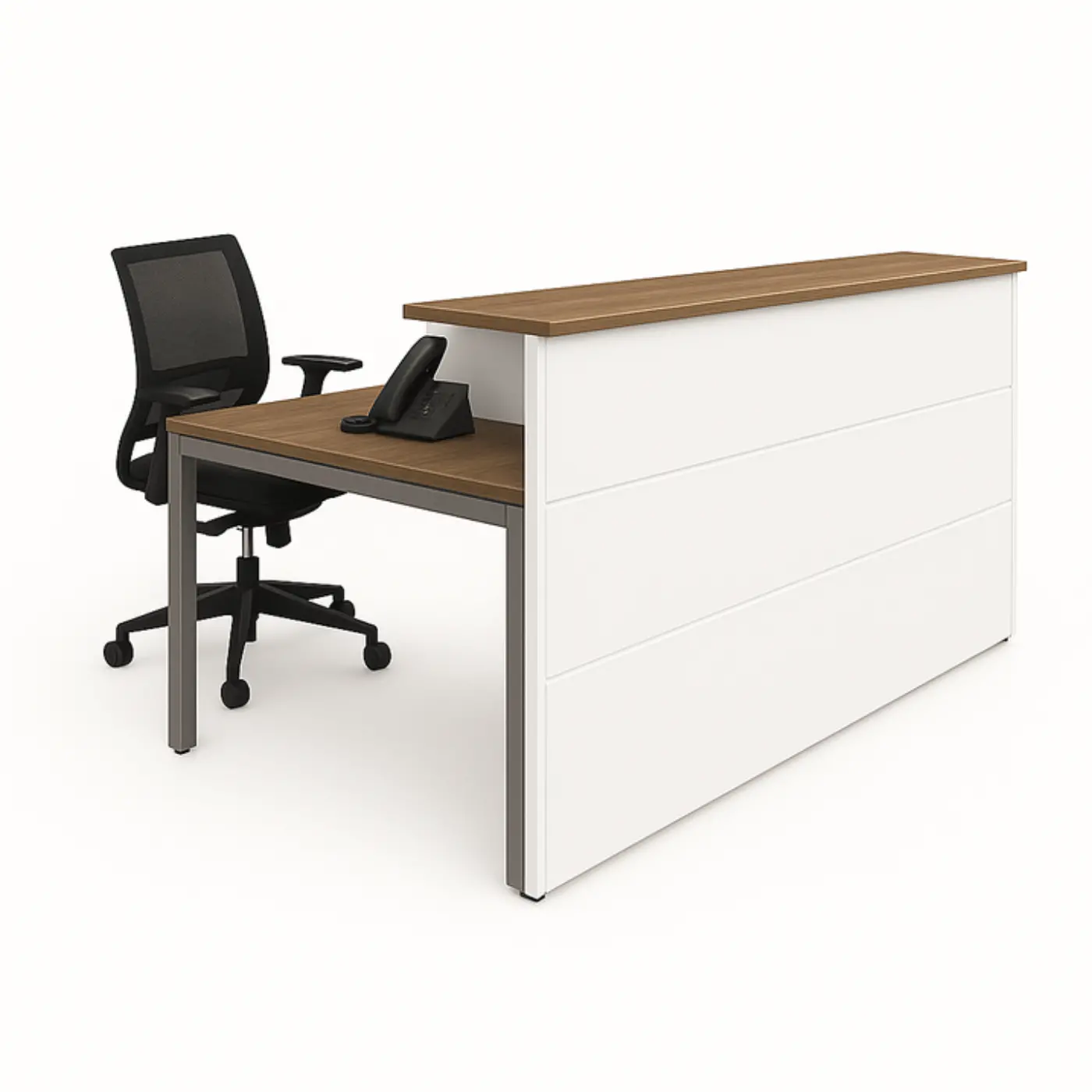 Recepción recta con estructura metálica y frentes en melamina.