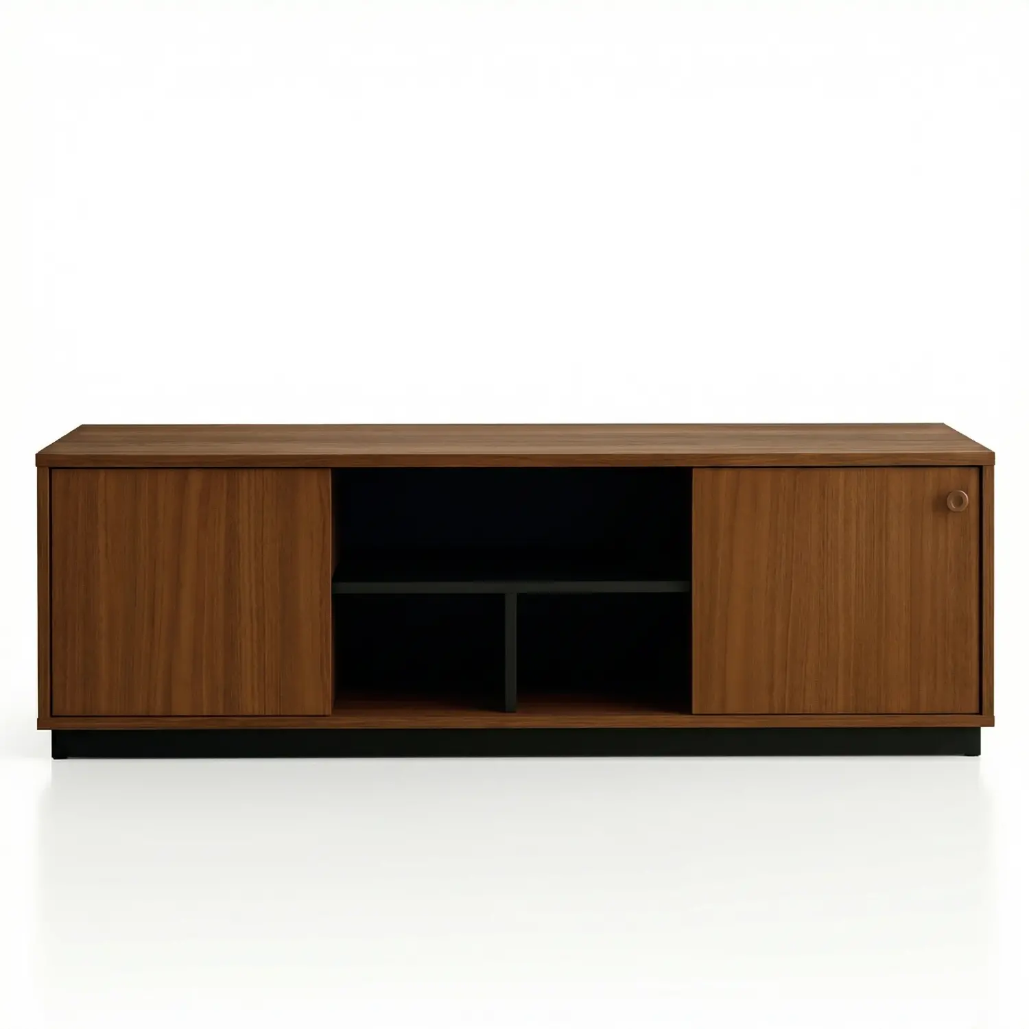 Credenza en melamina con una puerta, entrepaño central y cubierta de 28 mm.